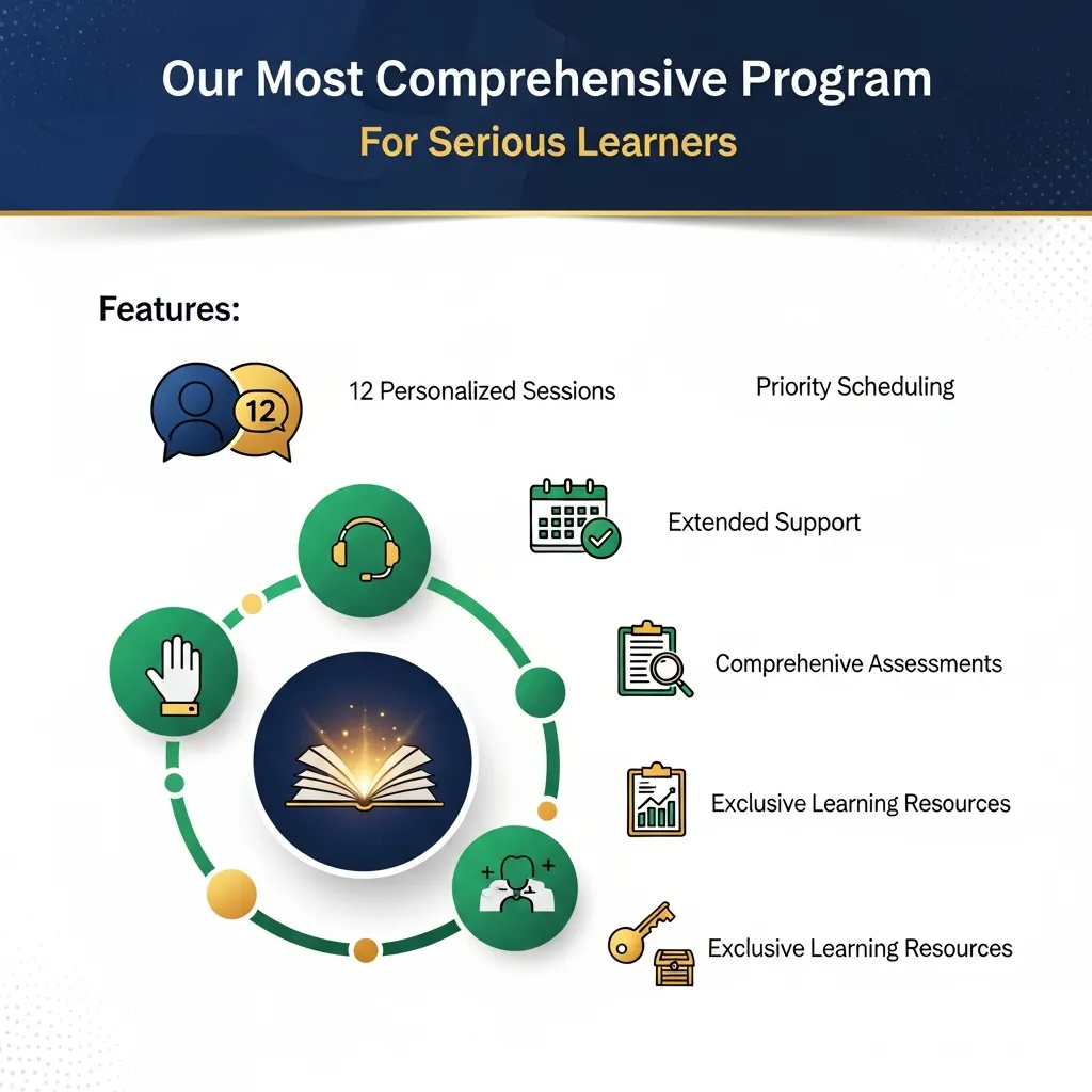 Our most comprehensive program for serious learners. Features 12 personalized sessions, priority scheduling, extended support, comprehensive assessments, and exclusive learning resources.